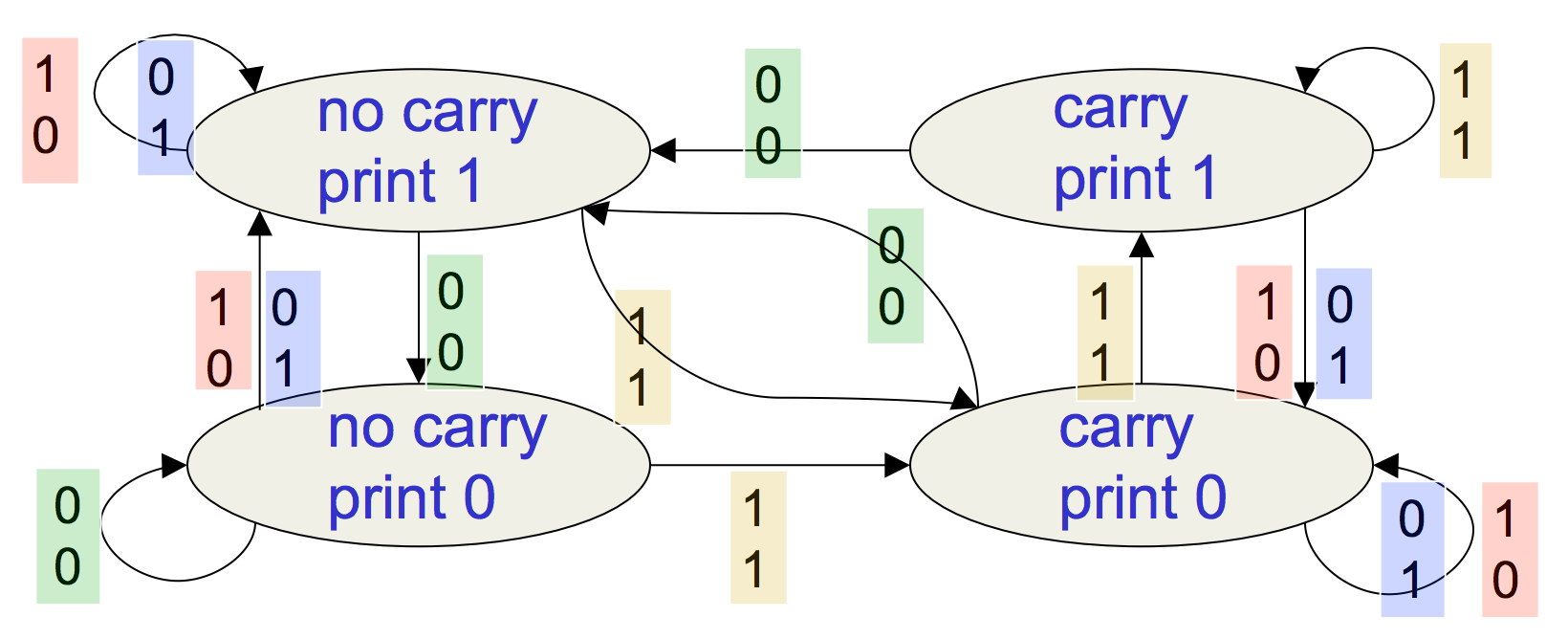 For instance, given the current state is “no carry print 0”, if the next column is “01”, then it turns out to be “no carry print 1”.